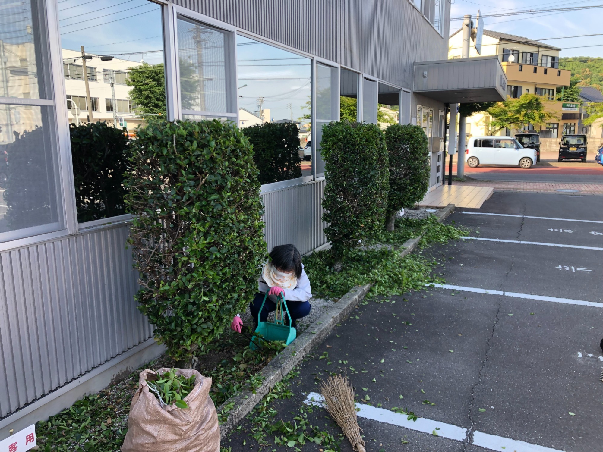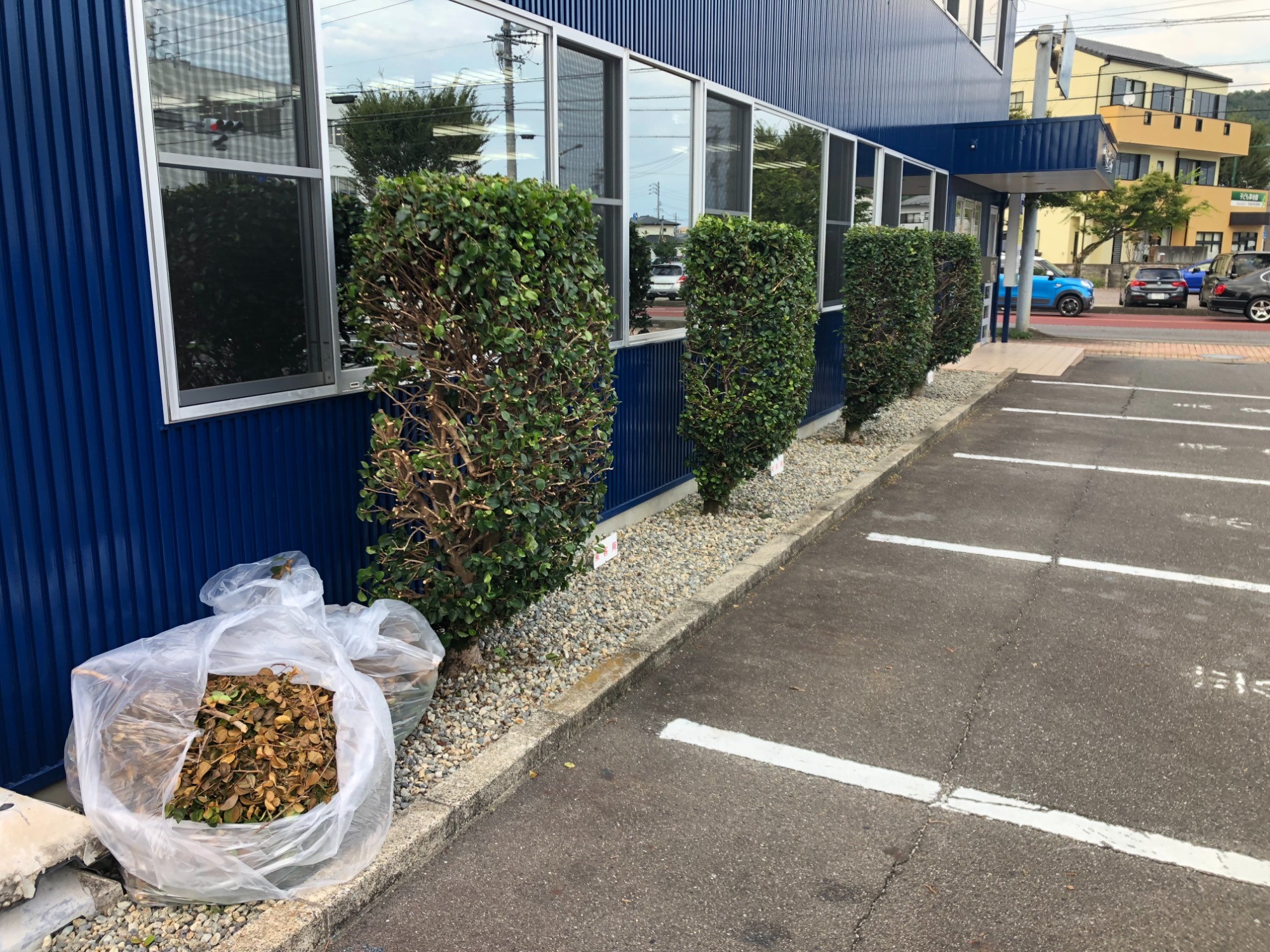 本日は弊社社屋の改修工事に伴い足場設置の前に植栽の剪定作業を行いました。