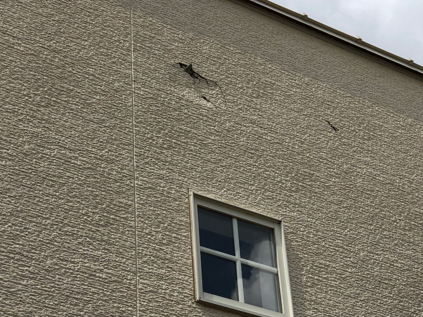 台風21号で隣地から屋根材が飛んできて壁に突き刺さって大変なことになりました。